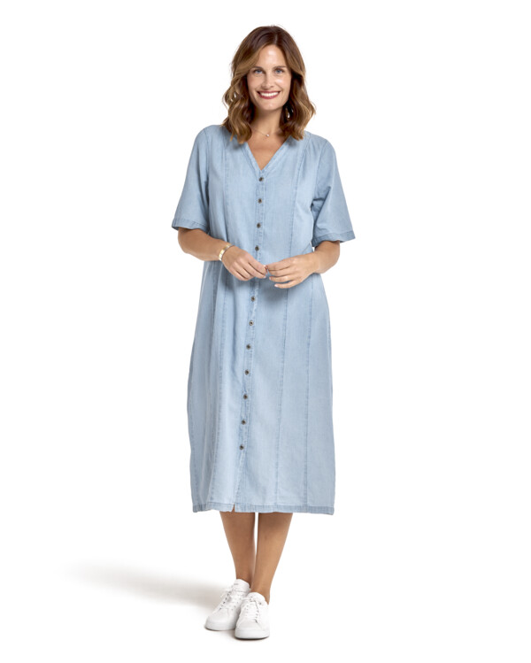 Stilren og behagelig denimkjole med gennemknappet front. Den V-udskæring i halsen giver et feminint udtryk, og de halvla...