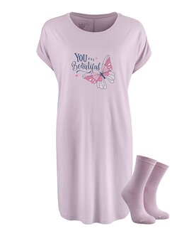 Som en ekstra overraskelse følger et par farvematchede bambusstrømper i one size med, flot pakket sammen med natkjolen og helt uden ekstra omkostninger.